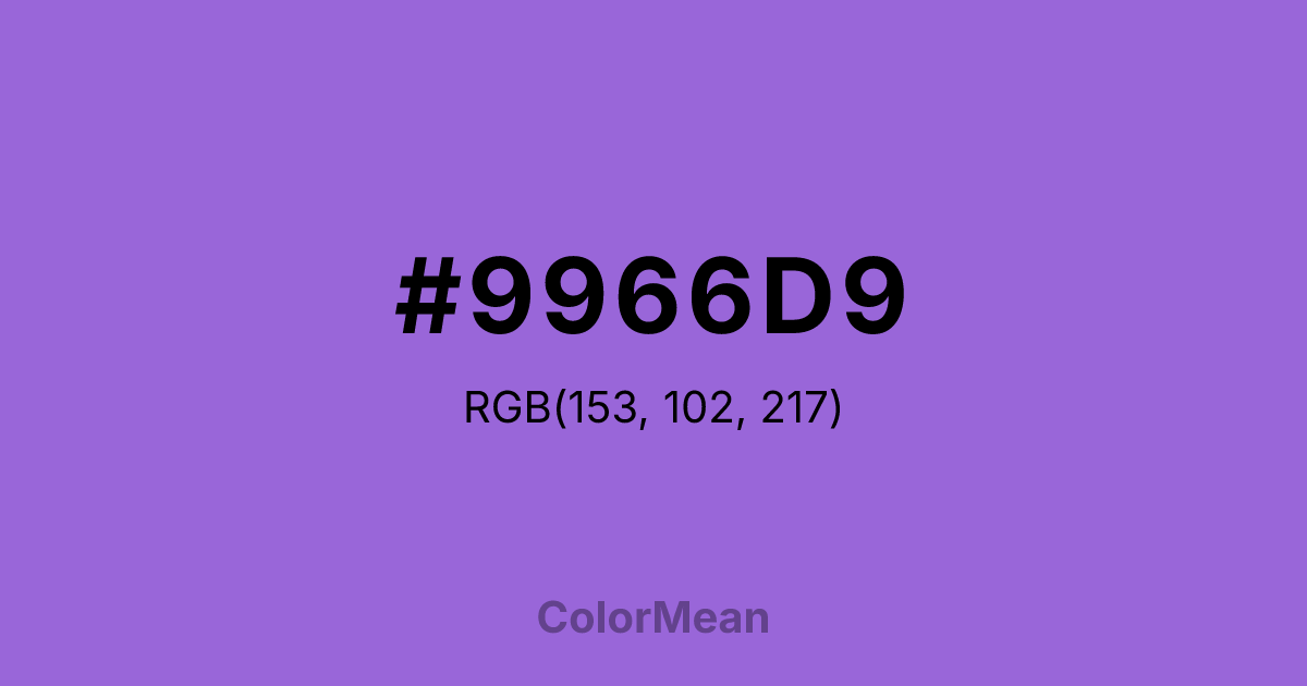 #9966D9 RGB value is (153, 102, 217). The hex color red value is 153, green is 102, and blue is 217. Its HSL format shows a hue of 267°, saturation of 60 percent, and lightness of 63 percent. The CMYK process values are 29 percent, 53 percent, 0 percent, 15 percent.