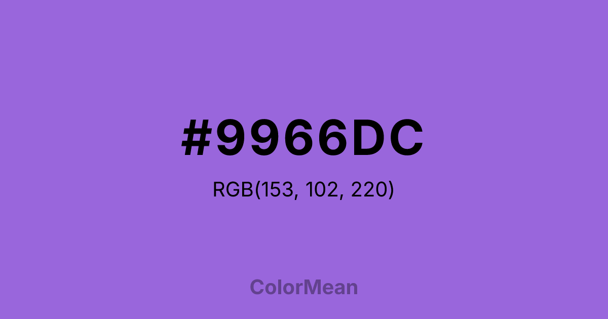 #9966DC RGB value is (153, 102, 220). The hex color red value is 153, green is 102, and blue is 220. Its HSL format shows a hue of 266°, saturation of 63 percent, and lightness of 63 percent. The CMYK process values are 30 percent, 54 percent, 0 percent, 14 percent.