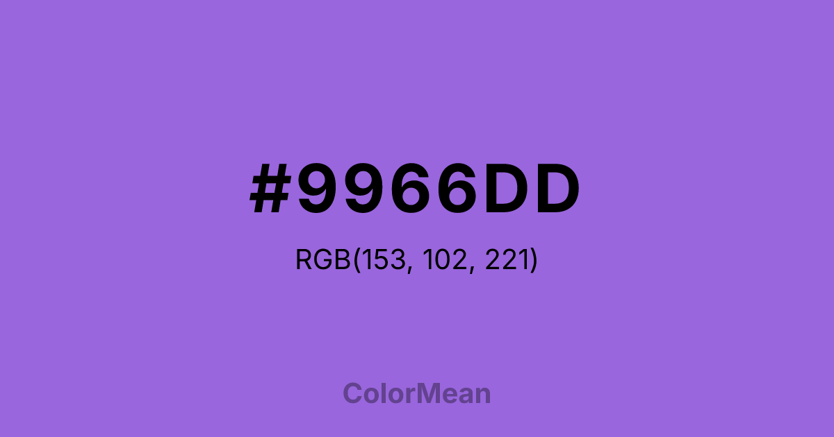 #9966DD RGB value is (153, 102, 221). The hex color red value is 153, green is 102, and blue is 221. Its HSL format shows a hue of 266°, saturation of 64 percent, and lightness of 63 percent. The CMYK process values are 31 percent, 54 percent, 0 percent, 13 percent.