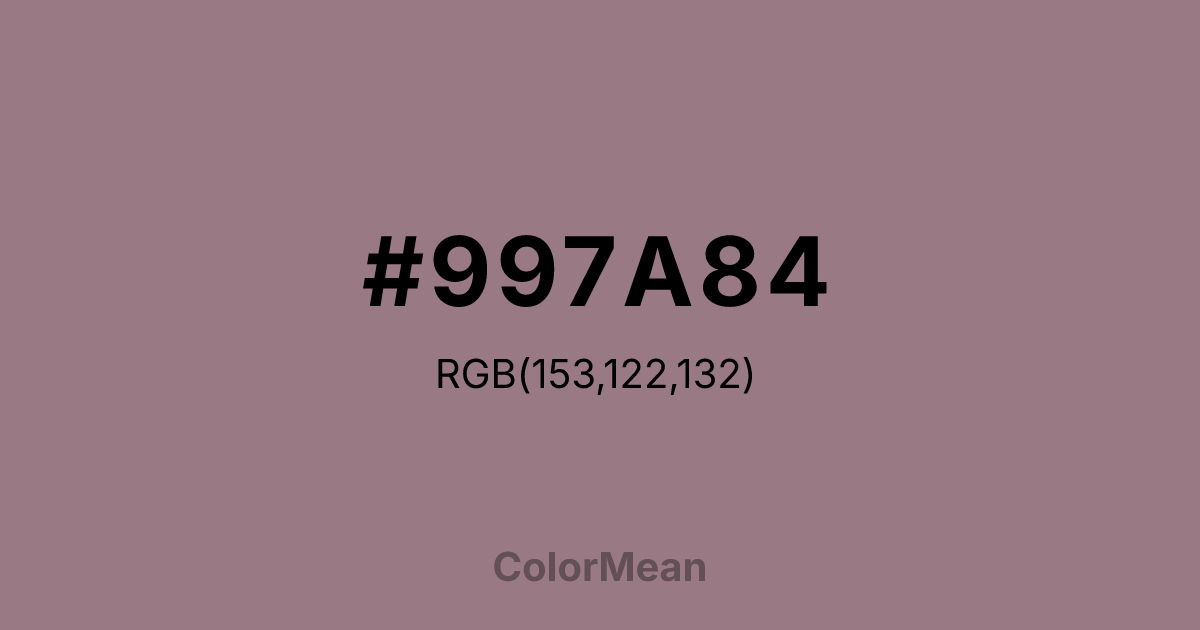 #997A84 RGB value is (153, 122, 132). The hex color red value is 153, green is 122, and blue is 132. Its HSL format shows a hue of 341°, saturation of 13 percent, and lightness of 54 percent. The CMYK process values are 0 percent, 20 percent, 14 percent, 40 percent.