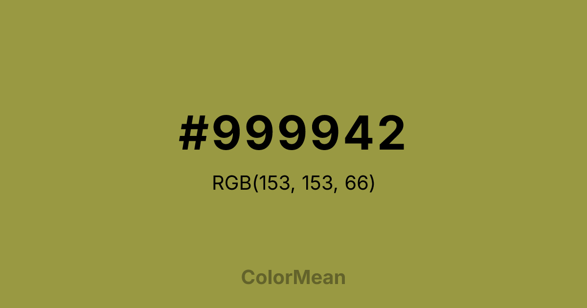 #999942 RGB value is (153, 153, 66). The hex color red value is 153, green is 153, and blue is 66. Its HSL format shows a hue of 60°, saturation of 40 percent, and lightness of 43 percent. The CMYK process values are 0 percent, 0 percent, 57 percent, 40 percent.