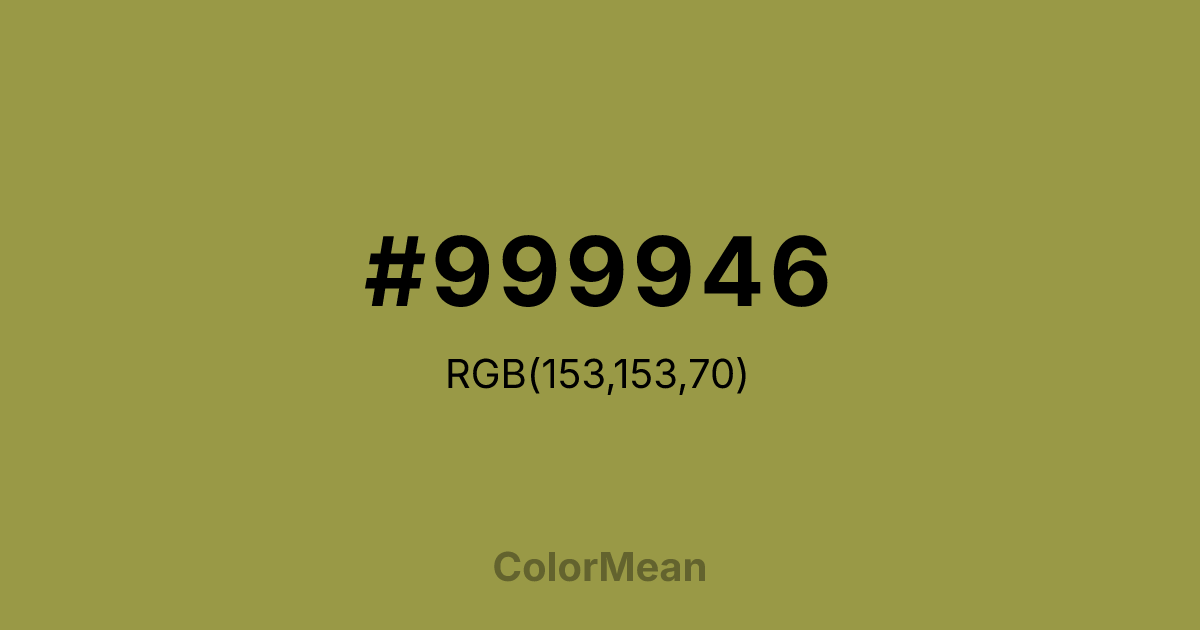 #999946 RGB value is (153, 153, 70). The hex color red value is 153, green is 153, and blue is 70. Its HSL format shows a hue of 60°, saturation of 37 percent, and lightness of 44 percent. The CMYK process values are 0 percent, 0 percent, 54 percent, 40 percent.