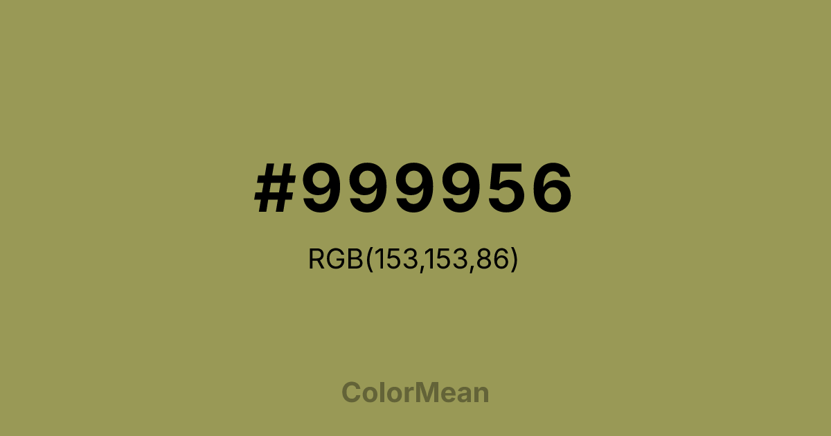 #999956 RGB value is (153, 153, 86). The hex color red value is 153, green is 153, and blue is 86. Its HSL format shows a hue of 60°, saturation of 28 percent, and lightness of 47 percent. The CMYK process values are 0 percent, 0 percent, 44 percent, 40 percent.