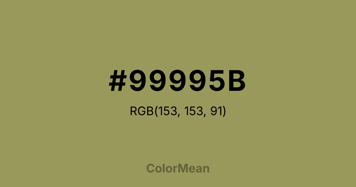 #99995B RGB value is (153, 153, 91). The hex color red value is 153, green is 153, and blue is 91. Its HSL format shows a hue of 60°, saturation of 25 percent, and lightness of 48 percent. The CMYK process values are 0 percent, 0 percent, 41 percent, 40 percent.