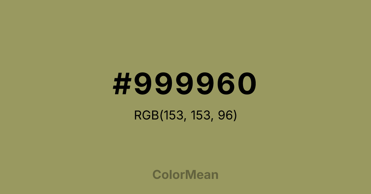 #999960 RGB value is (153, 153, 96). The hex color red value is 153, green is 153, and blue is 96. Its HSL format shows a hue of 60°, saturation of 23 percent, and lightness of 49 percent. The CMYK process values are 0 percent, 0 percent, 37 percent, 40 percent.