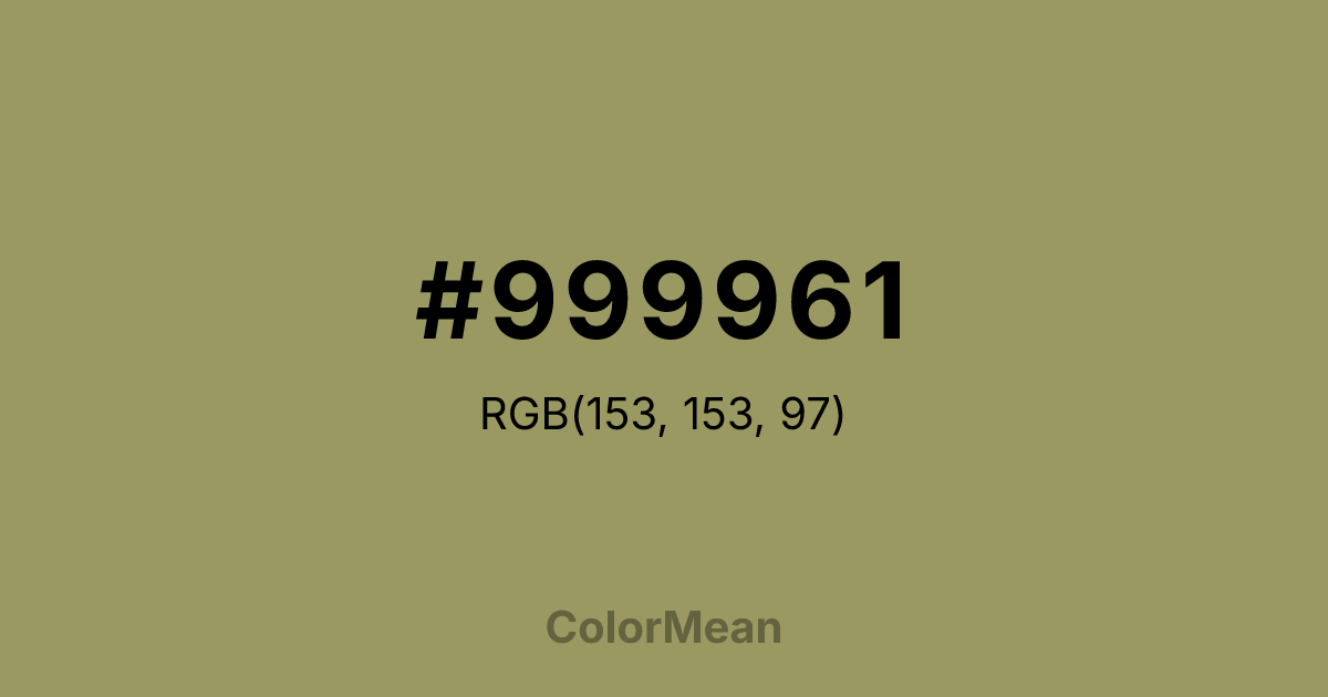 #999961 RGB value is (153, 153, 97). The hex color red value is 153, green is 153, and blue is 97. Its HSL format shows a hue of 60°, saturation of 22 percent, and lightness of 49 percent. The CMYK process values are 0 percent, 0 percent, 37 percent, 40 percent.