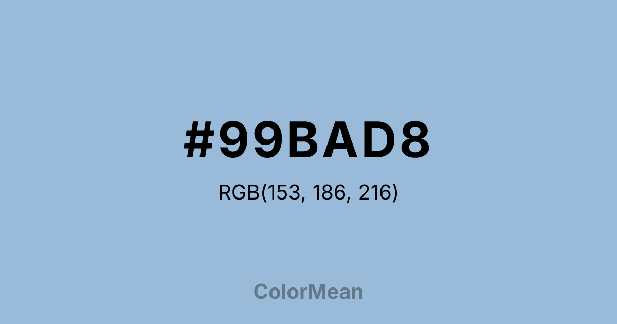 #99BAD8 RGB value is (153, 186, 216). The hex color red value is 153, green is 186, and blue is 216. Its HSL format shows a hue of 209°, saturation of 45 percent, and lightness of 72 percent. The CMYK process values are 29 percent, 14 percent, 0 percent, 15 percent.