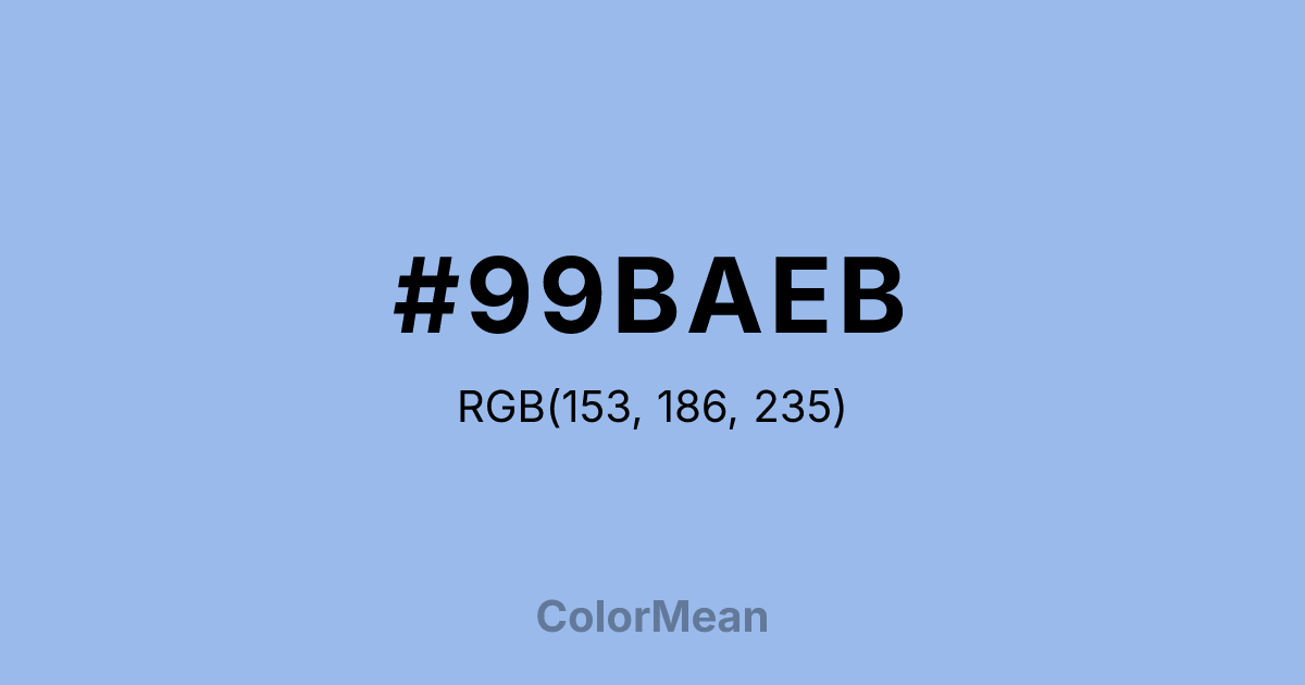 #99BAEB RGB value is (153, 186, 235). The hex color red value is 153, green is 186, and blue is 235. Its HSL format shows a hue of 216°, saturation of 67 percent, and lightness of 76 percent. The CMYK process values are 35 percent, 21 percent, 0 percent, 8 percent.