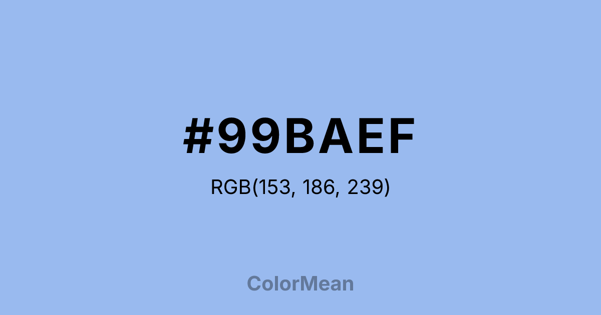 #99BAEF RGB value is (153, 186, 239). The hex color red value is 153, green is 186, and blue is 239. Its HSL format shows a hue of 217°, saturation of 73 percent, and lightness of 77 percent. The CMYK process values are 36 percent, 22 percent, 0 percent, 6 percent.