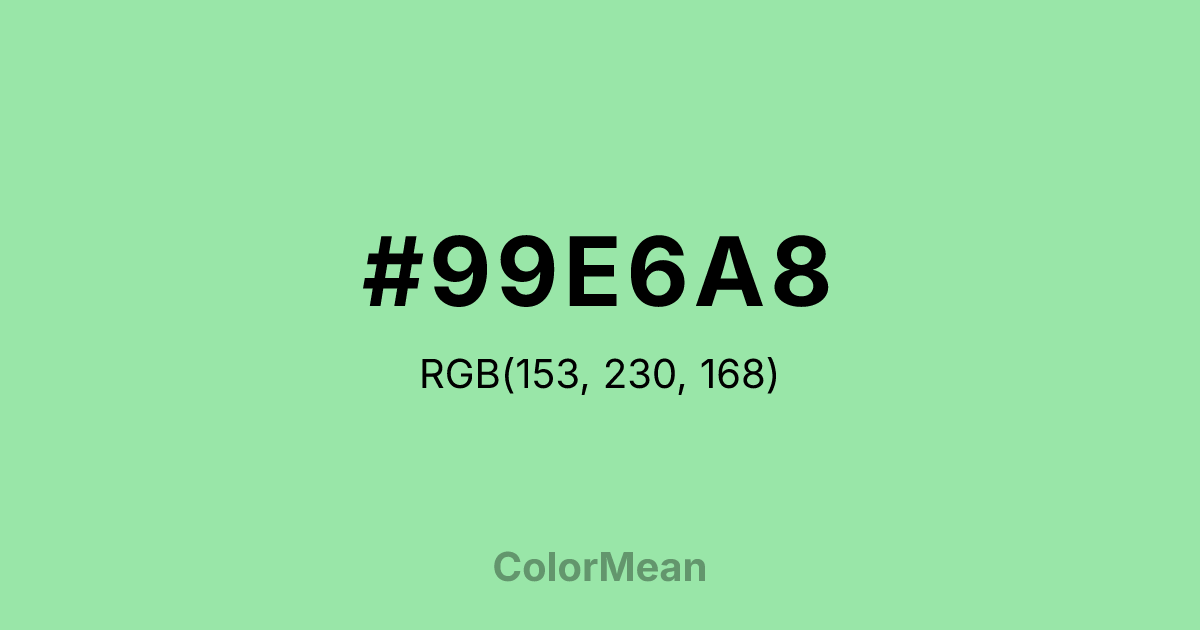 #99E6A8 RGB value is (153, 230, 168). The hex color red value is 153, green is 230, and blue is 168. Its HSL format shows a hue of 132°, saturation of 61 percent, and lightness of 75 percent. The CMYK process values are 33 percent, 0 percent, 27 percent, 10 percent.