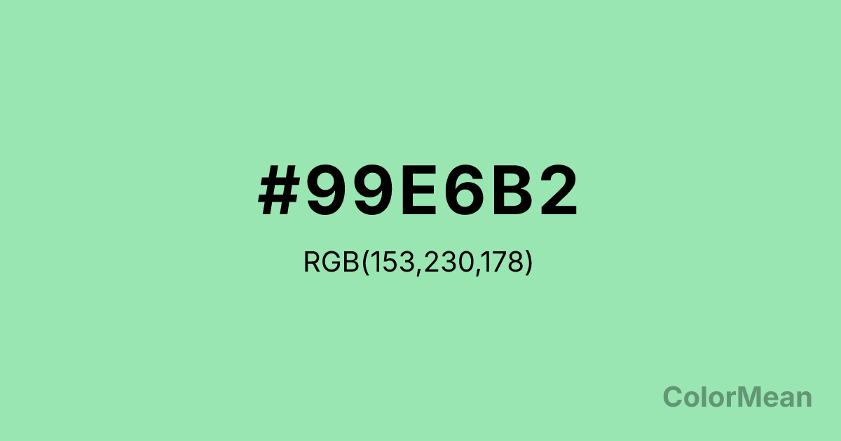 #99E6B2 RGB value is (153, 230, 178). The hex color red value is 153, green is 230, and blue is 178. Its HSL format shows a hue of 139°, saturation of 61 percent, and lightness of 75 percent. The CMYK process values are 33 percent, 0 percent, 23 percent, 10 percent.