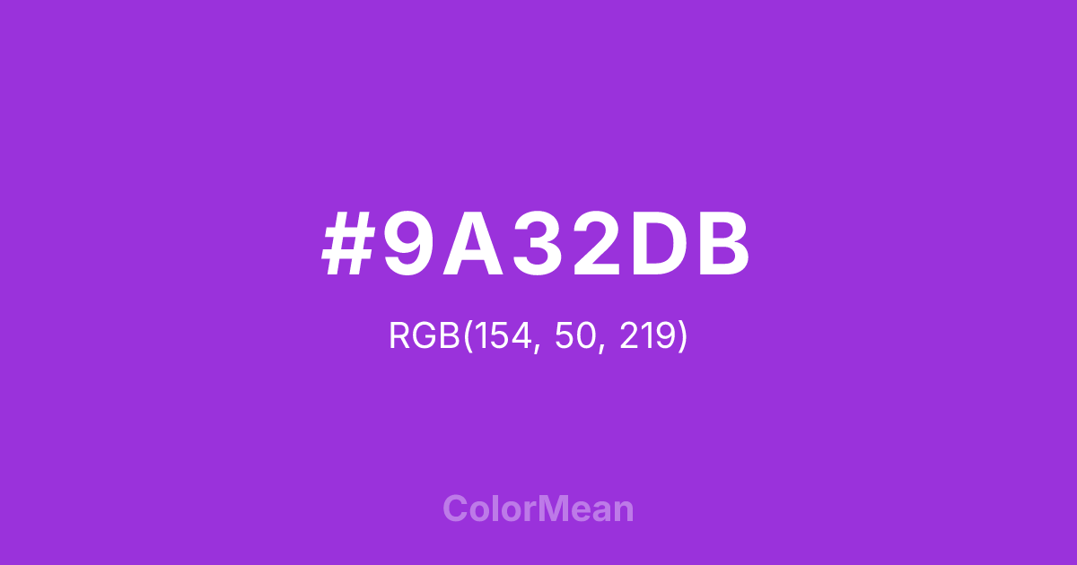 #9A32DB RGB value is (154, 50, 219). The hex color red value is 154, green is 50, and blue is 219. Its HSL format shows a hue of 277°, saturation of 70 percent, and lightness of 53 percent. The CMYK process values are 30 percent, 77 percent, 0 percent, 14 percent.