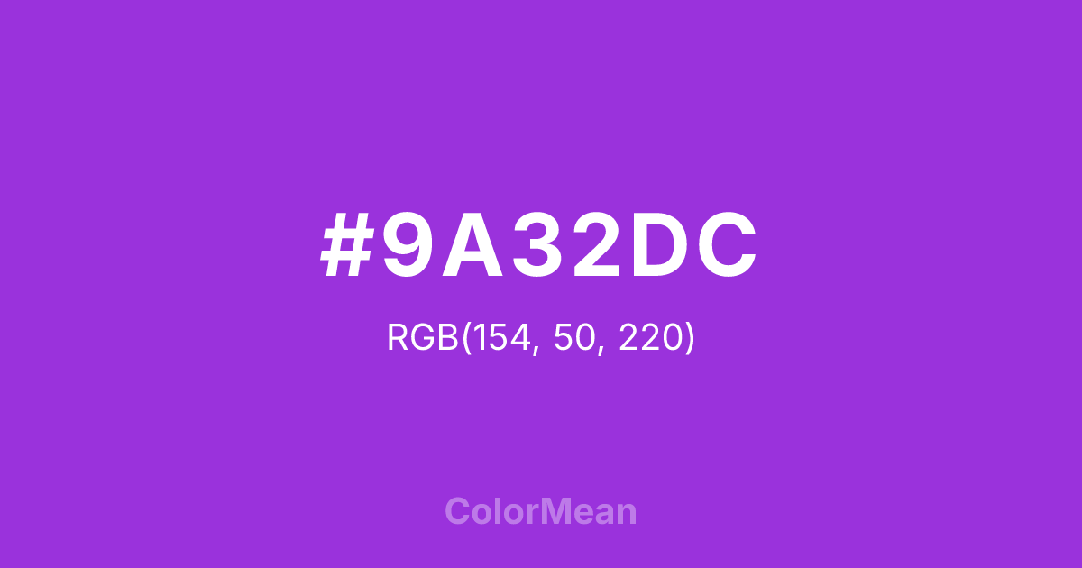 #9A32DC RGB value is (154, 50, 220). The hex color red value is 154, green is 50, and blue is 220. Its HSL format shows a hue of 277°, saturation of 71 percent, and lightness of 53 percent. The CMYK process values are 30 percent, 77 percent, 0 percent, 14 percent.