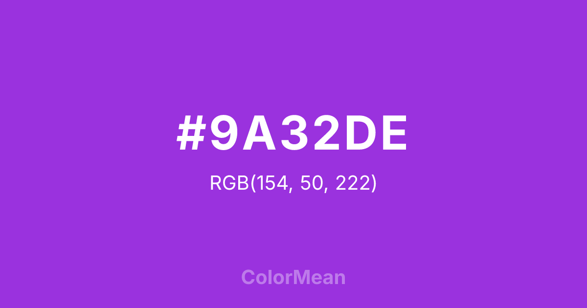 #9A32DE RGB value is (154, 50, 222). The hex color red value is 154, green is 50, and blue is 222. Its HSL format shows a hue of 276°, saturation of 72 percent, and lightness of 53 percent. The CMYK process values are 31 percent, 77 percent, 0 percent, 13 percent.