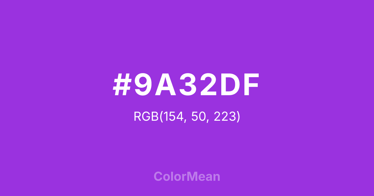 #9A32DF RGB value is (154, 50, 223). The hex color red value is 154, green is 50, and blue is 223. Its HSL format shows a hue of 276°, saturation of 73 percent, and lightness of 54 percent. The CMYK process values are 31 percent, 78 percent, 0 percent, 13 percent.