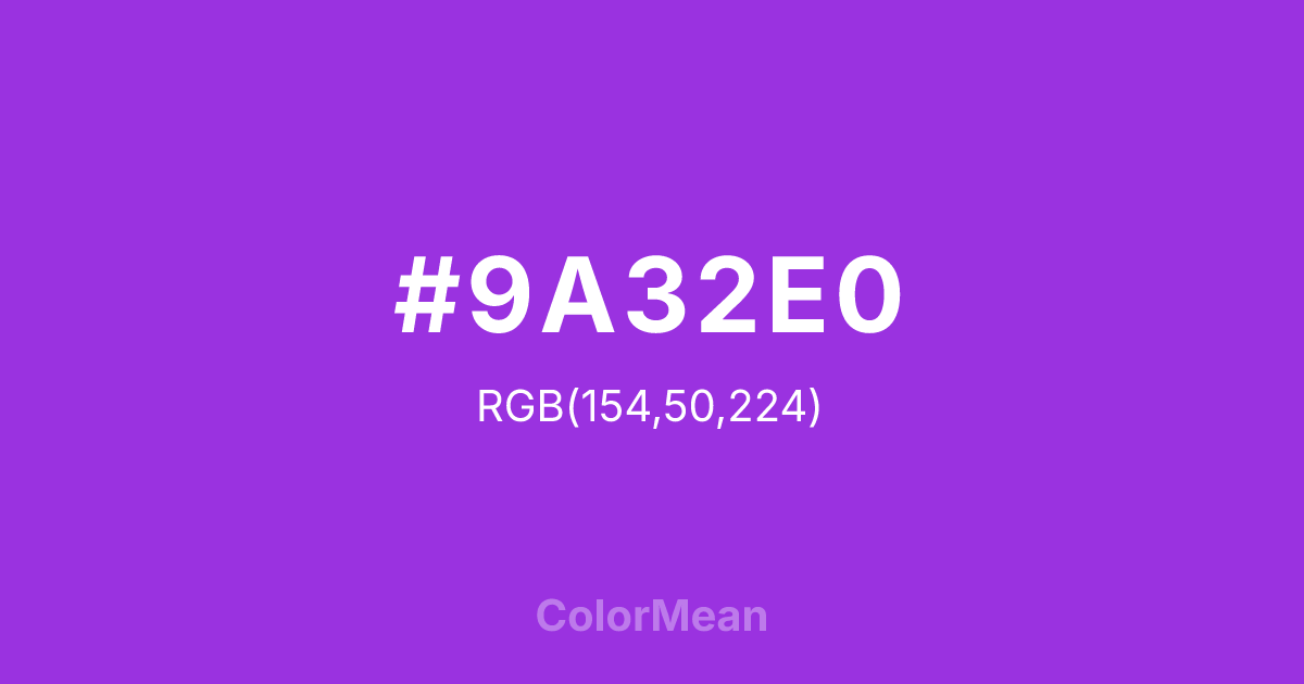 #9A32E0 RGB value is (154, 50, 224). The hex color red value is 154, green is 50, and blue is 224. Its HSL format shows a hue of 276°, saturation of 74 percent, and lightness of 54 percent. The CMYK process values are 31 percent, 78 percent, 0 percent, 12 percent.