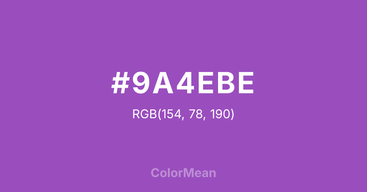 #9A4EBE RGB value is (154, 78, 190). The hex color red value is 154, green is 78, and blue is 190. Its HSL format shows a hue of 281°, saturation of 46 percent, and lightness of 53 percent. The CMYK process values are 19 percent, 59 percent, 0 percent, 25 percent.