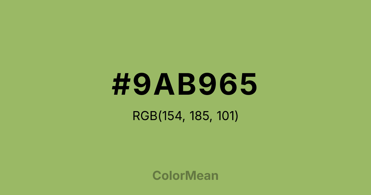 #9AB965 RGB value is (154, 185, 101). The hex color red value is 154, green is 185, and blue is 101. Its HSL format shows a hue of 82°, saturation of 38 percent, and lightness of 56 percent. The CMYK process values are 17 percent, 0 percent, 45 percent, 27 percent.