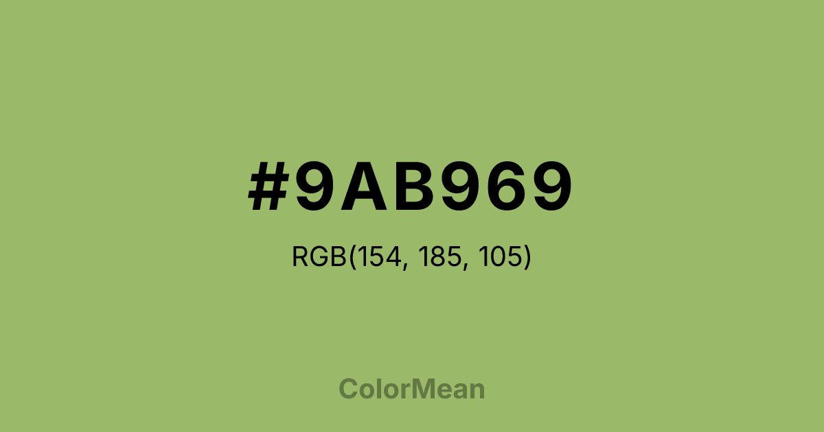 #9AB969 RGB value is (154, 185, 105). The hex color red value is 154, green is 185, and blue is 105. Its HSL format shows a hue of 83°, saturation of 36 percent, and lightness of 57 percent. The CMYK process values are 17 percent, 0 percent, 43 percent, 27 percent.