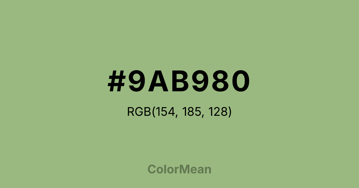 #9AB980 RGB value is (154, 185, 128). The hex color red value is 154, green is 185, and blue is 128. Its HSL format shows a hue of 93°, saturation of 29 percent, and lightness of 61 percent. The CMYK process values are 17 percent, 0 percent, 31 percent, 27 percent.