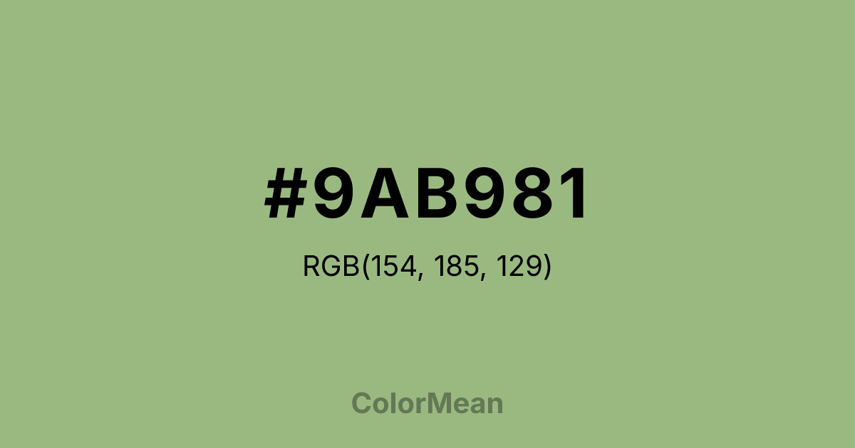 #9AB981 RGB value is (154, 185, 129). The hex color red value is 154, green is 185, and blue is 129. Its HSL format shows a hue of 93°, saturation of 29 percent, and lightness of 62 percent. The CMYK process values are 17 percent, 0 percent, 30 percent, 27 percent.