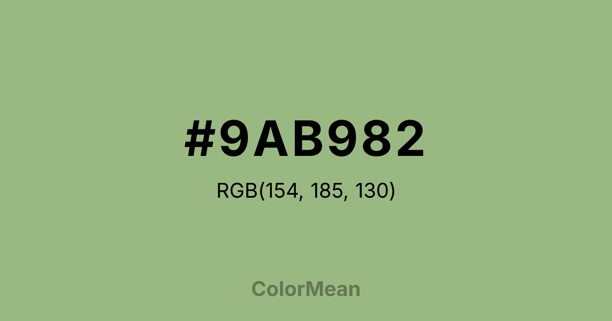 #9AB982 RGB value is (154, 185, 130). The hex color red value is 154, green is 185, and blue is 130. Its HSL format shows a hue of 94°, saturation of 28 percent, and lightness of 62 percent. The CMYK process values are 17 percent, 0 percent, 30 percent, 27 percent.
