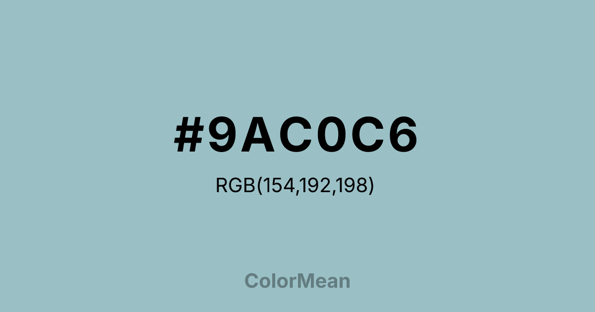 #9AC0C6 RGB value is (154, 192, 198). The hex color red value is 154, green is 192, and blue is 198. Its HSL format shows a hue of 188°, saturation of 28 percent, and lightness of 69 percent. The CMYK process values are 22 percent, 3 percent, 0 percent, 22 percent.