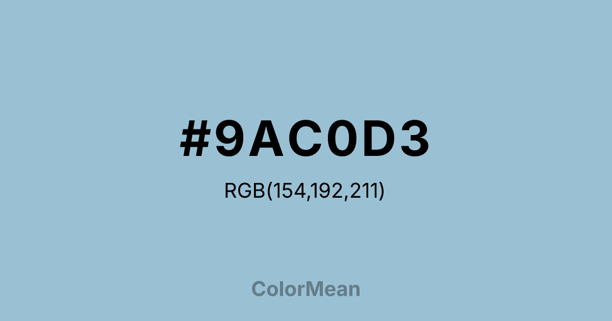 #9AC0D3 RGB value is (154, 192, 211). The hex color red value is 154, green is 192, and blue is 211. Its HSL format shows a hue of 200°, saturation of 39 percent, and lightness of 72 percent. The CMYK process values are 27 percent, 9 percent, 0 percent, 17 percent.