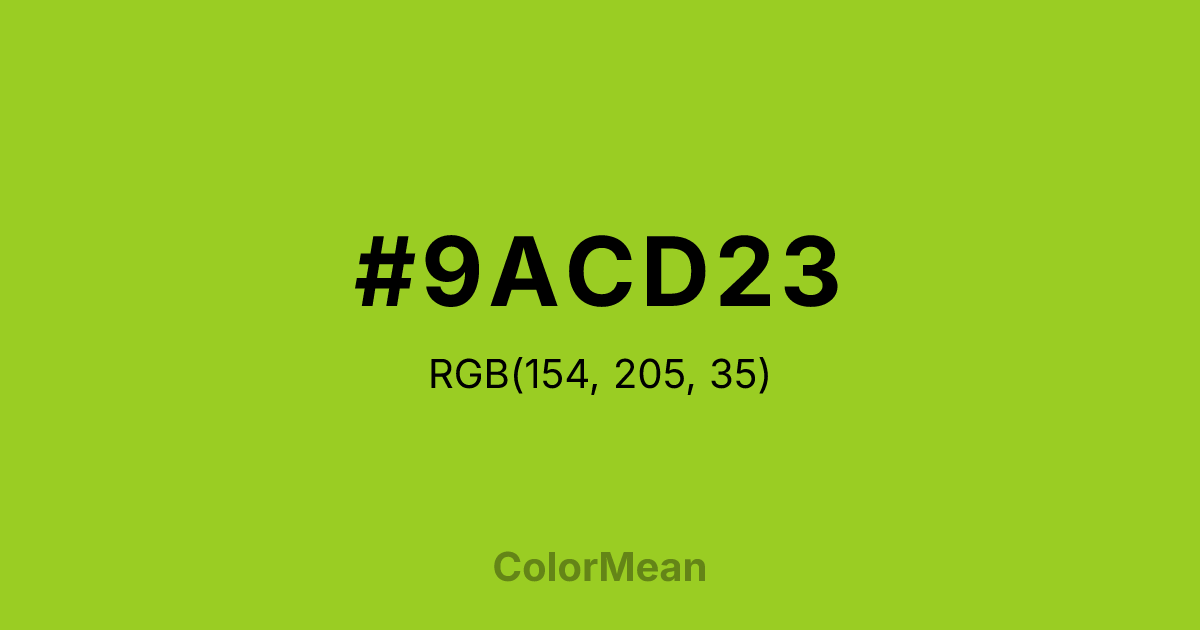 #9ACD23 RGB value is (154, 205, 35). The hex color red value is 154, green is 205, and blue is 35. Its HSL format shows a hue of 78°, saturation of 71 percent, and lightness of 47 percent. The CMYK process values are 25 percent, 0 percent, 83 percent, 20 percent.