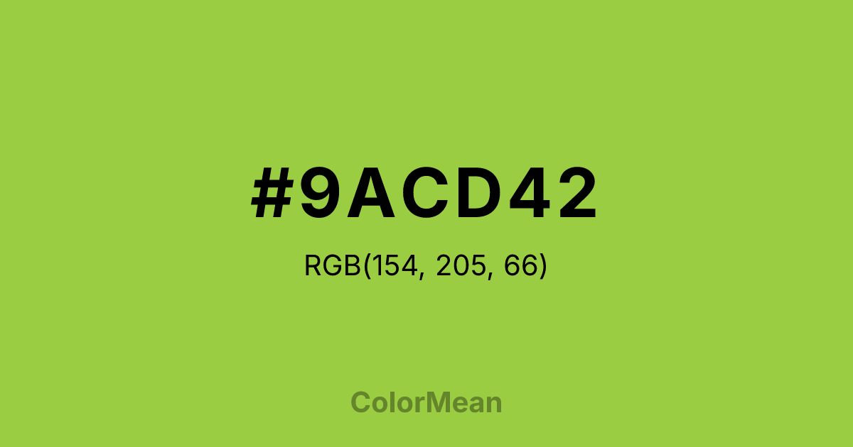 #9ACD42 RGB value is (154, 205, 66). The hex color red value is 154, green is 205, and blue is 66. Its HSL format shows a hue of 82°, saturation of 58 percent, and lightness of 53 percent. The CMYK process values are 25 percent, 0 percent, 68 percent, 20 percent.