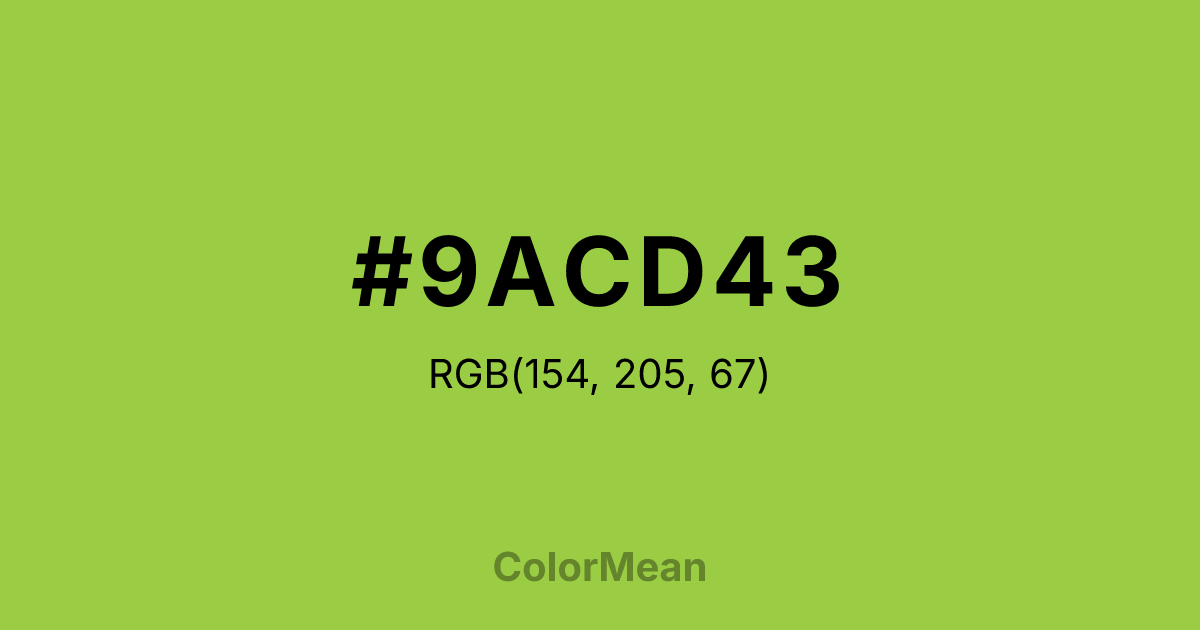 #9ACD43 RGB value is (154, 205, 67). The hex color red value is 154, green is 205, and blue is 67. Its HSL format shows a hue of 82°, saturation of 58 percent, and lightness of 53 percent. The CMYK process values are 25 percent, 0 percent, 67 percent, 20 percent.