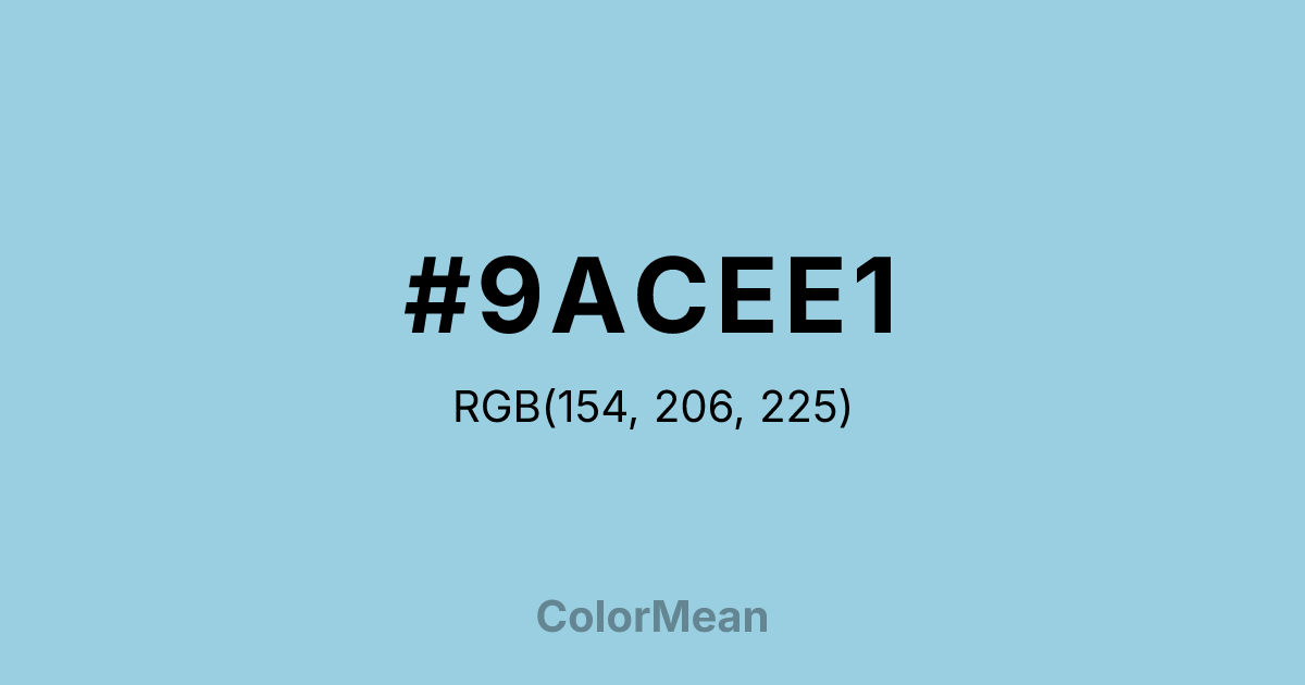 #9ACEE1 RGB value is (154, 206, 225). The hex color red value is 154, green is 206, and blue is 225. Its HSL format shows a hue of 196°, saturation of 54 percent, and lightness of 74 percent. The CMYK process values are 32 percent, 8 percent, 0 percent, 12 percent.