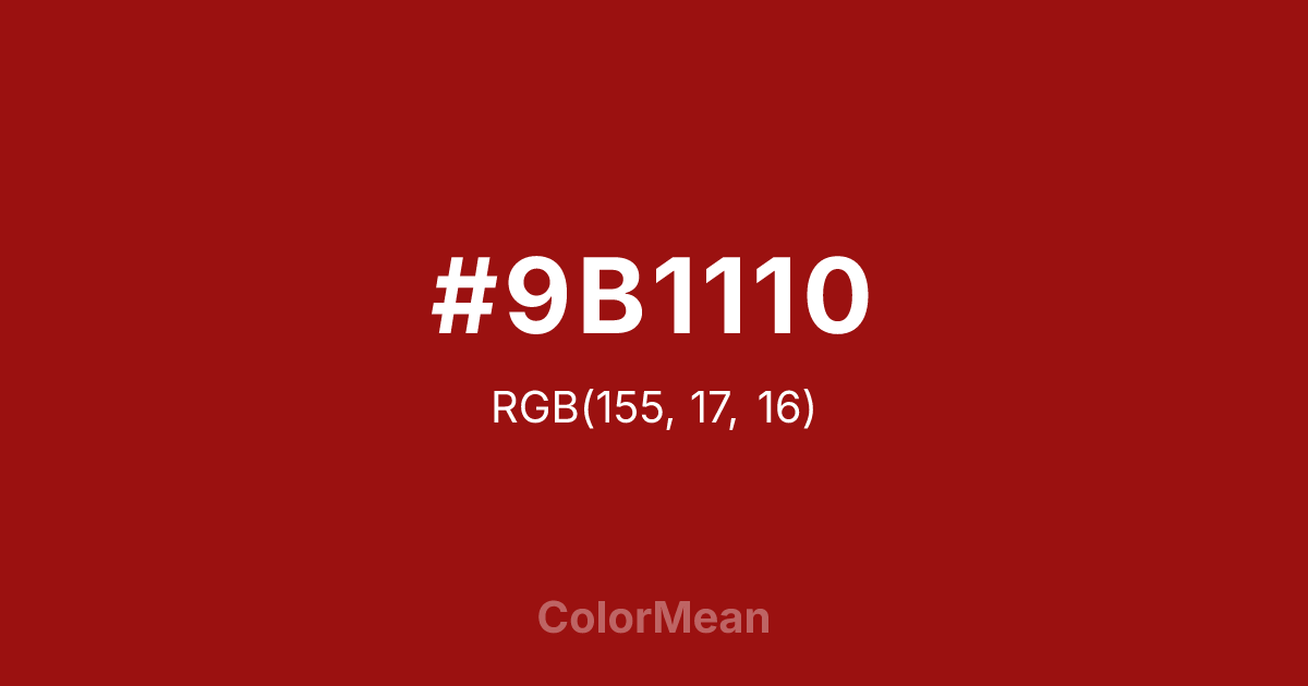 #9B1110 RGB value is (155, 17, 16). The hex color red value is 155, green is 17, and blue is 16. Its HSL format shows a hue of 0°, saturation of 81 percent, and lightness of 34 percent. The CMYK process values are 0 percent, 89 percent, 90 percent, 39 percent.
