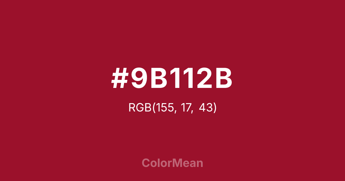 #9B112B RGB value is (155, 17, 43). The hex color red value is 155, green is 17, and blue is 43. Its HSL format shows a hue of 349°, saturation of 80 percent, and lightness of 34 percent. The CMYK process values are 0 percent, 89 percent, 72 percent, 39 percent.