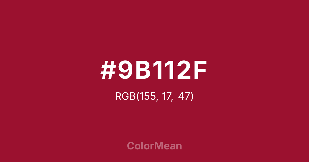 #9B112F RGB value is (155, 17, 47). The hex color red value is 155, green is 17, and blue is 47. Its HSL format shows a hue of 347°, saturation of 80 percent, and lightness of 34 percent. The CMYK process values are 0 percent, 89 percent, 70 percent, 39 percent.