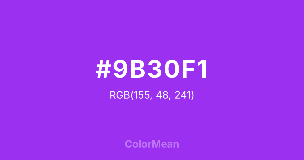 #9B30F1 RGB value is (155, 48, 241). The hex color red value is 155, green is 48, and blue is 241. Its HSL format shows a hue of 273°, saturation of 87 percent, and lightness of 57 percent. The CMYK process values are 36 percent, 80 percent, 0 percent, 5 percent.