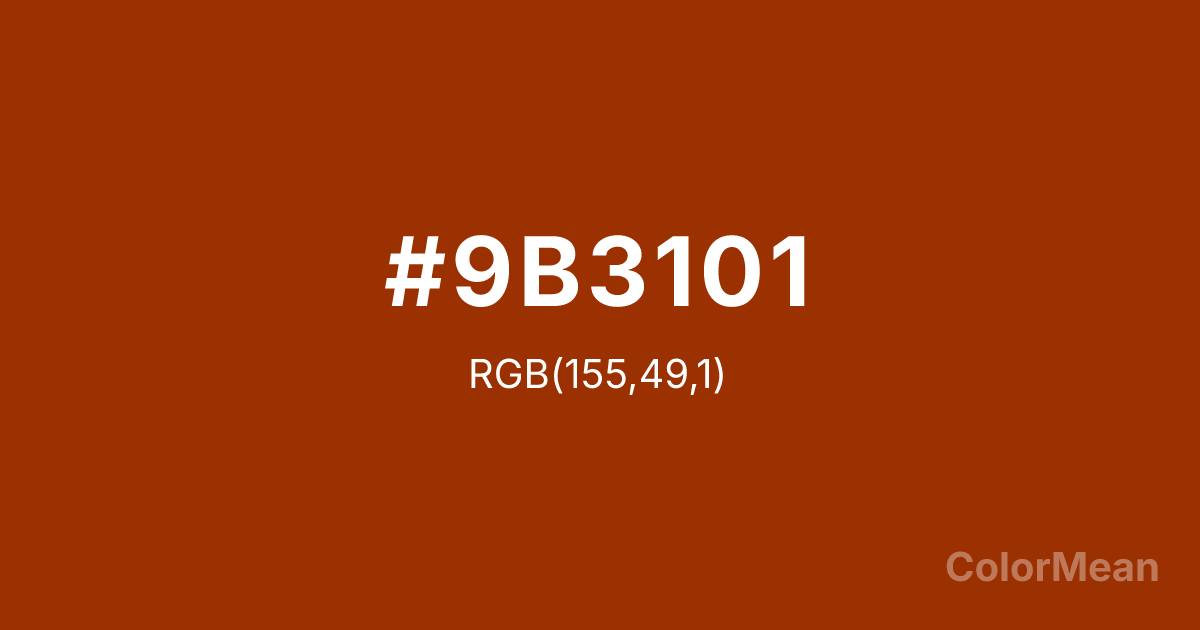 #9B3101 RGB value is (155, 49, 1). The hex color red value is 155, green is 49, and blue is 1. Its HSL format shows a hue of 19°, saturation of 99 percent, and lightness of 31 percent. The CMYK process values are 0 percent, 68 percent, 99 percent, 39 percent.