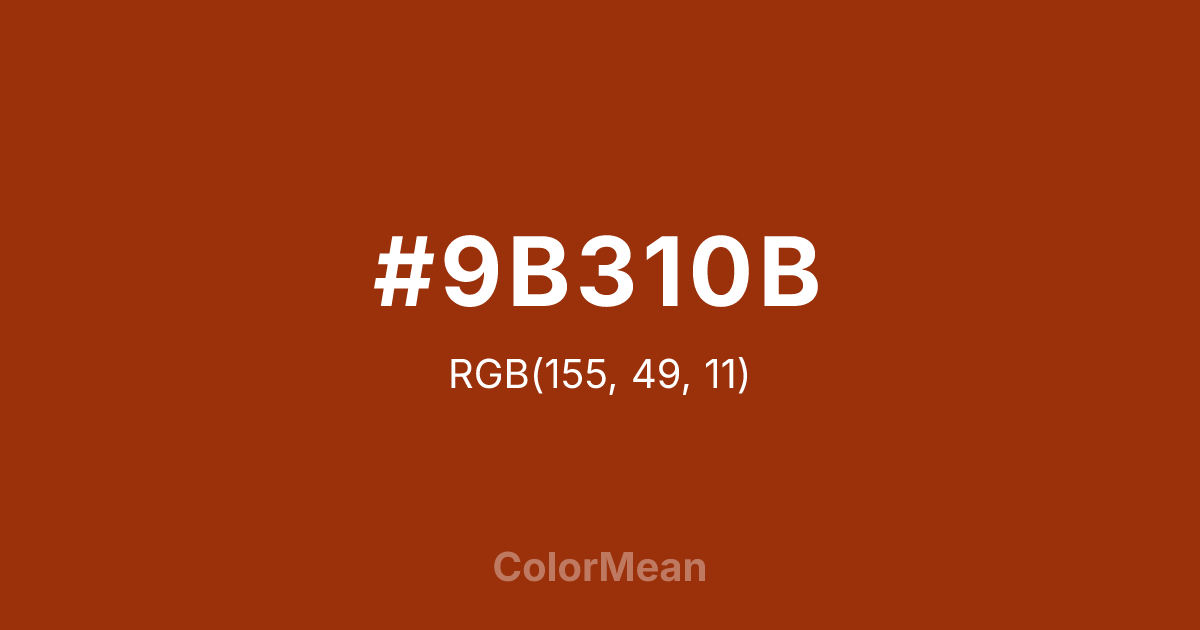 #9B310B RGB value is (155, 49, 11). The hex color red value is 155, green is 49, and blue is 11. Its HSL format shows a hue of 16°, saturation of 87 percent, and lightness of 33 percent. The CMYK process values are 0 percent, 68 percent, 93 percent, 39 percent.