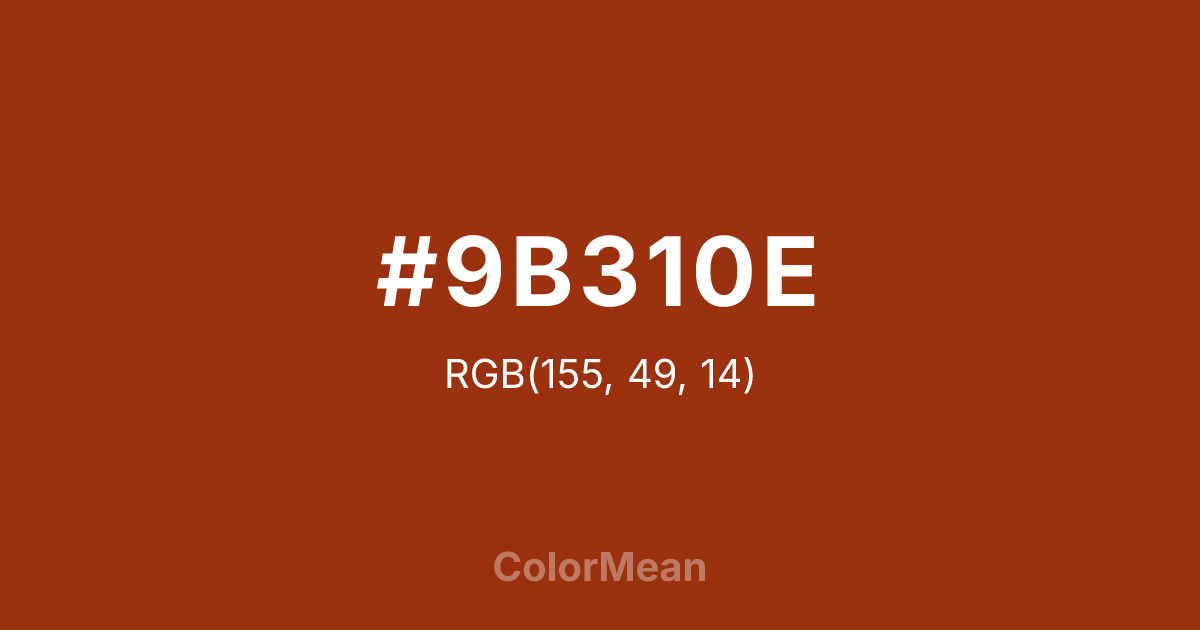 #9B310E RGB value is (155, 49, 14). The hex color red value is 155, green is 49, and blue is 14. Its HSL format shows a hue of 15°, saturation of 83 percent, and lightness of 33 percent. The CMYK process values are 0 percent, 68 percent, 91 percent, 39 percent.