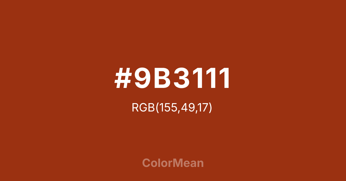 #9B3111 RGB value is (155, 49, 17). The hex color red value is 155, green is 49, and blue is 17. Its HSL format shows a hue of 14°, saturation of 80 percent, and lightness of 34 percent. The CMYK process values are 0 percent, 68 percent, 89 percent, 39 percent.