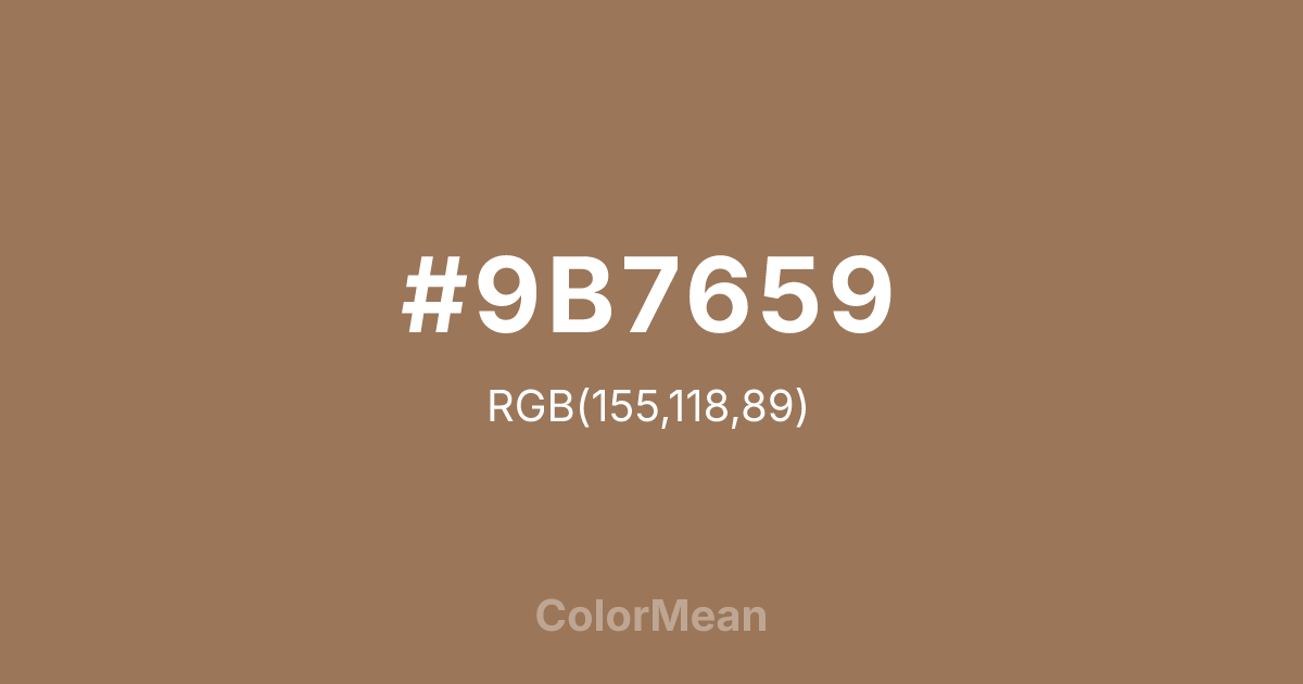 #9B7659 RGB value is (155, 118, 89). The hex color red value is 155, green is 118, and blue is 89. Its HSL format shows a hue of 26°, saturation of 27 percent, and lightness of 48 percent. The CMYK process values are 0 percent, 24 percent, 43 percent, 39 percent.