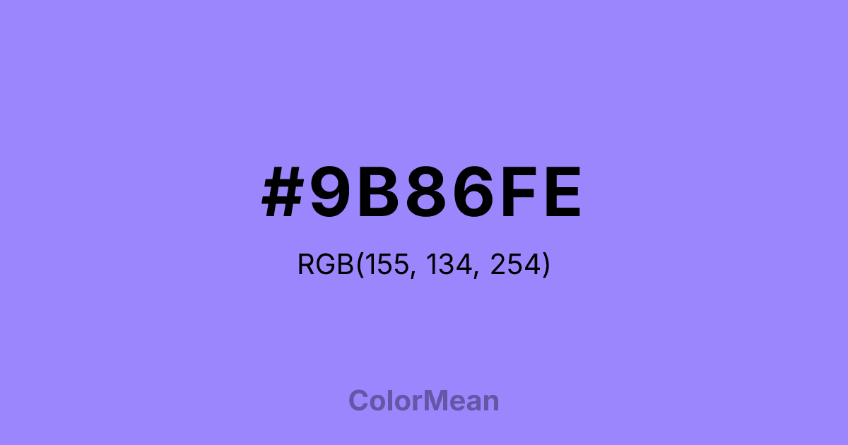 #9B86FE RGB value is (155, 134, 254). The hex color red value is 155, green is 134, and blue is 254. Its HSL format shows a hue of 251°, saturation of 98 percent, and lightness of 76 percent. The CMYK process values are 39 percent, 47 percent, 0 percent, 0 percent.