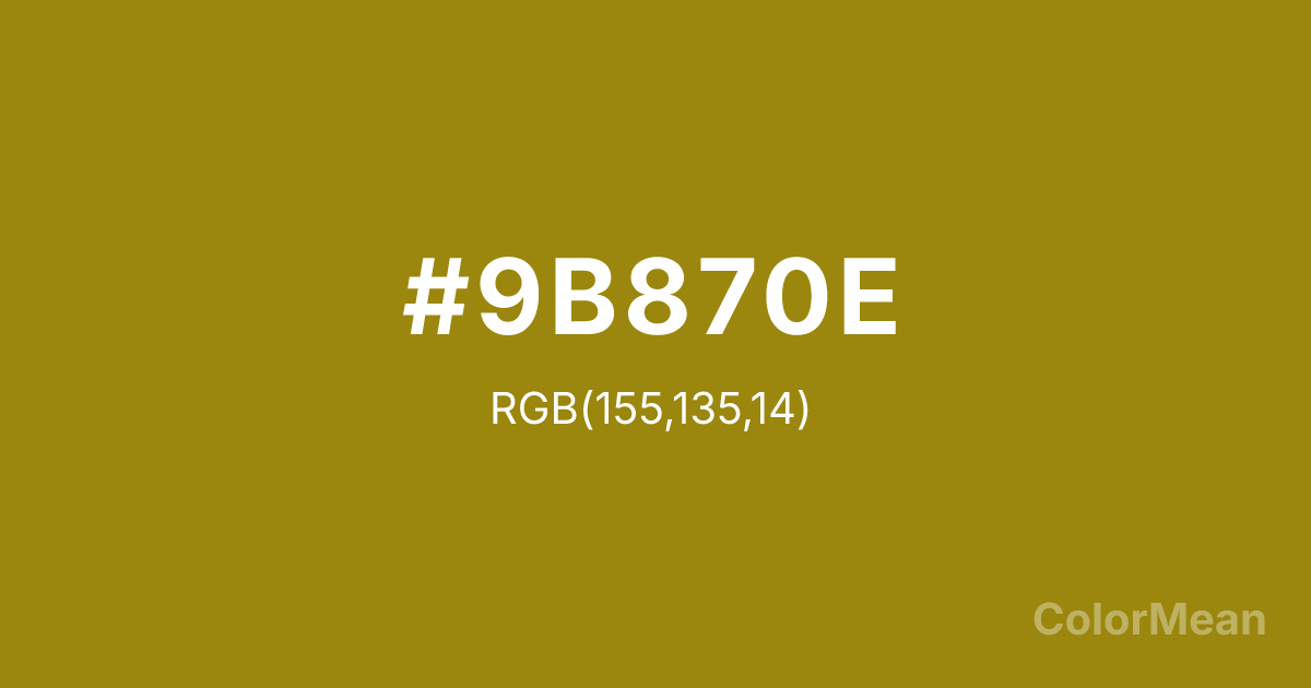#9B870E RGB value is (155, 135, 14). The hex color red value is 155, green is 135, and blue is 14. Its HSL format shows a hue of 51°, saturation of 83 percent, and lightness of 33 percent. The CMYK process values are 0 percent, 13 percent, 91 percent, 39 percent.