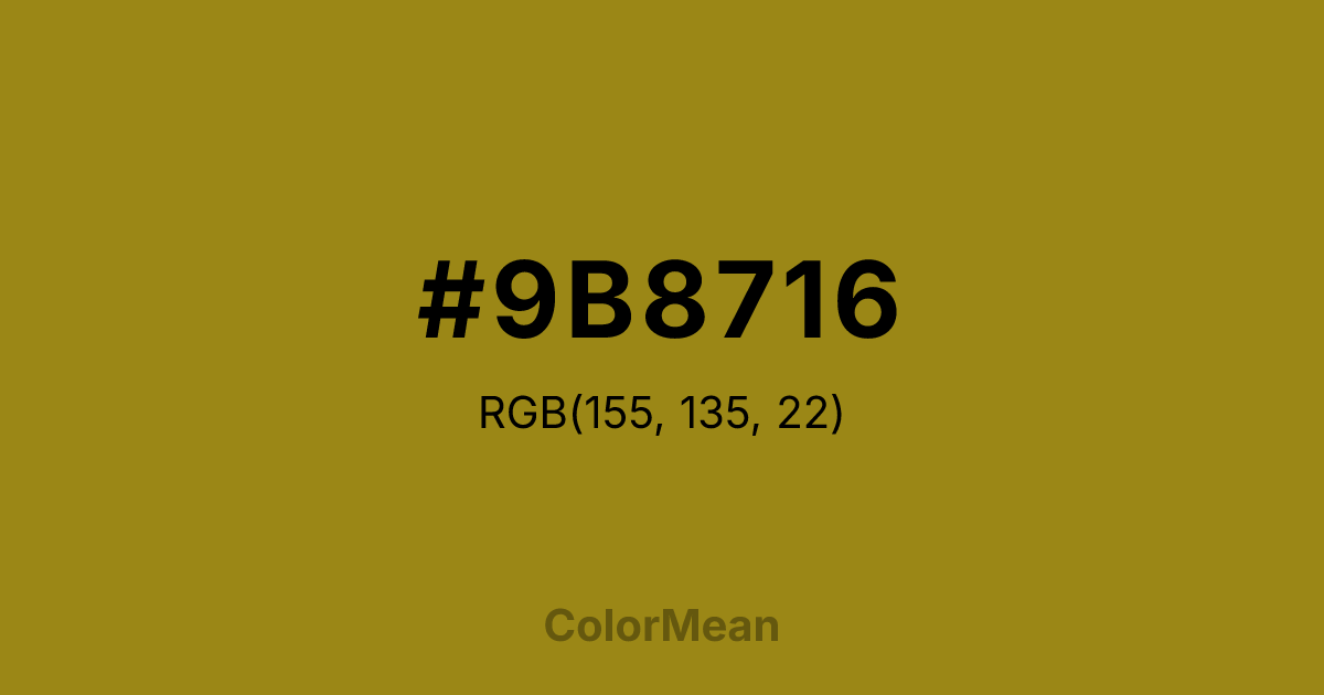 #9B8716 RGB value is (155, 135, 22). The hex color red value is 155, green is 135, and blue is 22. Its HSL format shows a hue of 51°, saturation of 75 percent, and lightness of 35 percent. The CMYK process values are 0 percent, 13 percent, 86 percent, 39 percent.