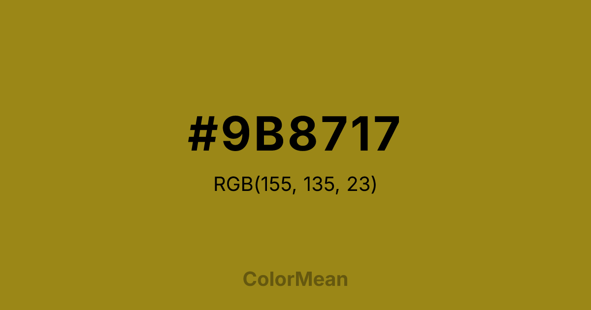 #9B8717 RGB value is (155, 135, 23). The hex color red value is 155, green is 135, and blue is 23. Its HSL format shows a hue of 51°, saturation of 74 percent, and lightness of 35 percent. The CMYK process values are 0 percent, 13 percent, 85 percent, 39 percent.