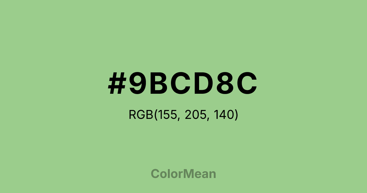 #9BCD8C RGB value is (155, 205, 140). The hex color red value is 155, green is 205, and blue is 140. Its HSL format shows a hue of 106°, saturation of 39 percent, and lightness of 68 percent. The CMYK process values are 24 percent, 0 percent, 32 percent, 20 percent.