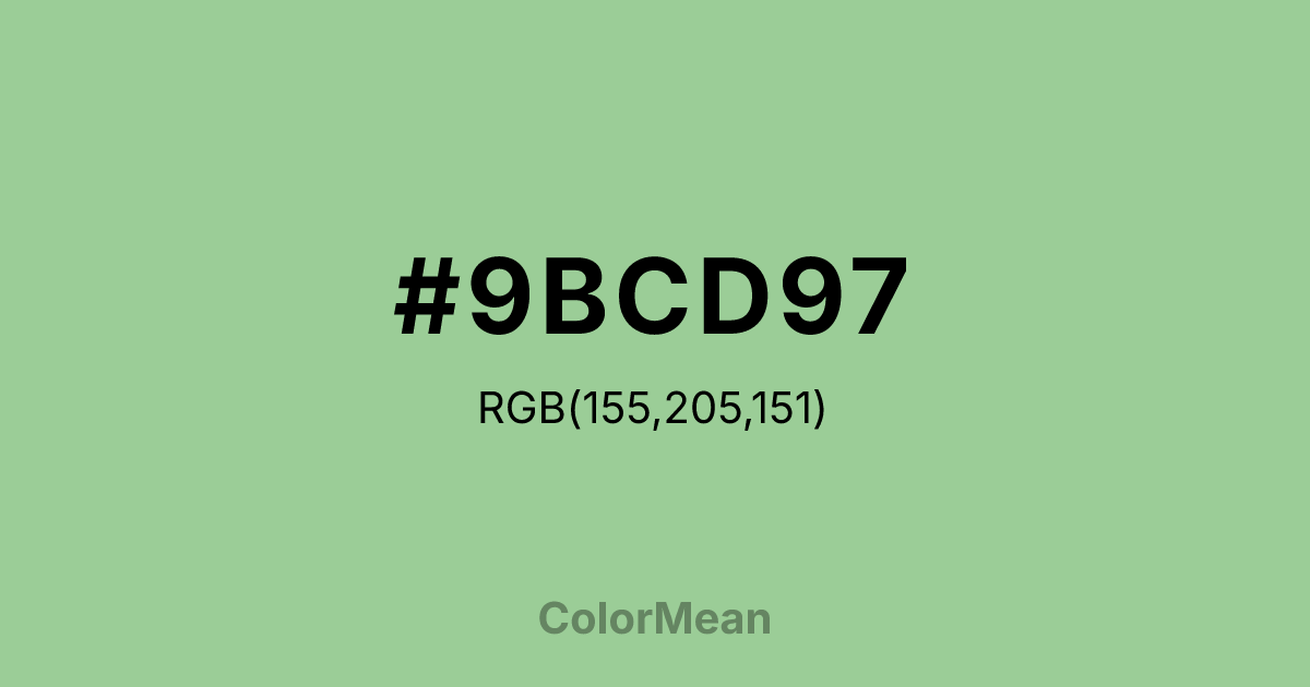 #9BCD97 RGB value is (155, 205, 151). The hex color red value is 155, green is 205, and blue is 151. Its HSL format shows a hue of 116°, saturation of 35 percent, and lightness of 70 percent. The CMYK process values are 24 percent, 0 percent, 26 percent, 20 percent.