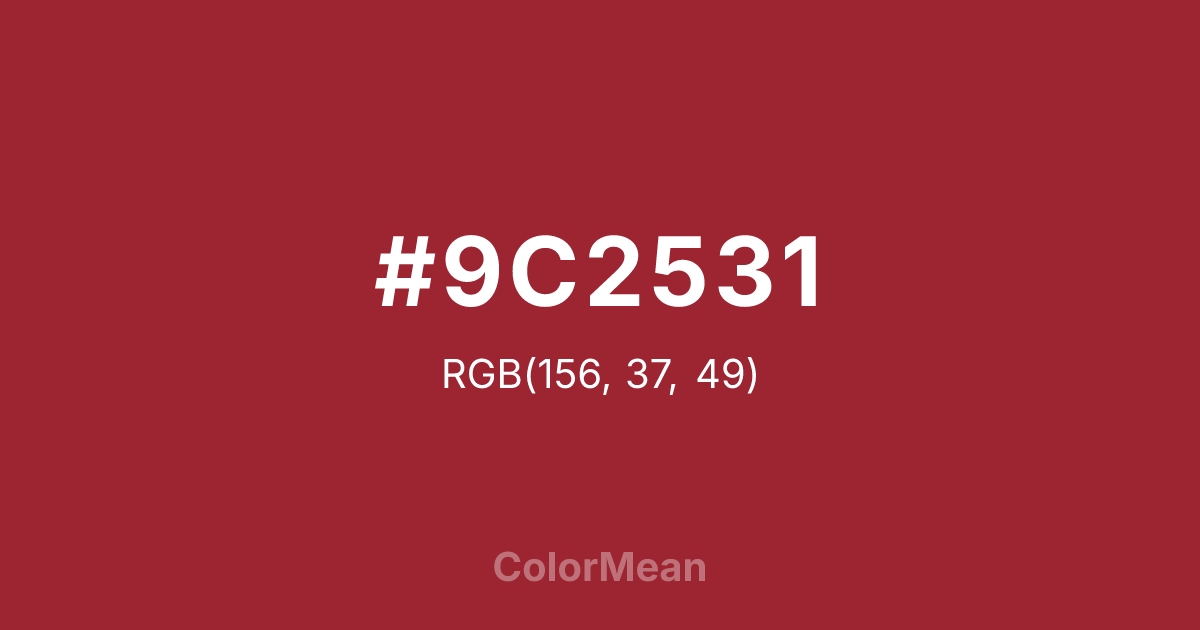 #9C2531 RGB value is (156, 37, 49). The hex color red value is 156, green is 37, and blue is 49. Its HSL format shows a hue of 354°, saturation of 62 percent, and lightness of 38 percent. The CMYK process values are 0 percent, 76 percent, 69 percent, 39 percent.