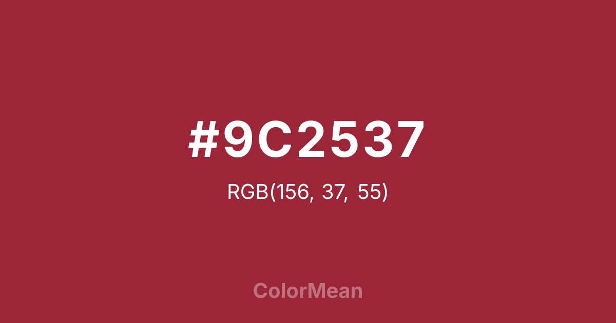 #9C2537 RGB value is (156, 37, 55). The hex color red value is 156, green is 37, and blue is 55. Its HSL format shows a hue of 351°, saturation of 62 percent, and lightness of 38 percent. The CMYK process values are 0 percent, 76 percent, 65 percent, 39 percent.