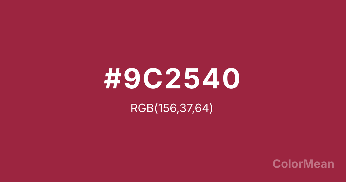 #9C2540 RGB value is (156, 37, 64). The hex color red value is 156, green is 37, and blue is 64. Its HSL format shows a hue of 346°, saturation of 62 percent, and lightness of 38 percent. The CMYK process values are 0 percent, 76 percent, 59 percent, 39 percent.